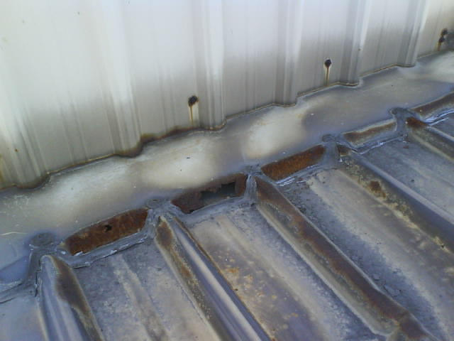 高雄抓漏-鐵皮屋漏水修繕 因凸出的部位擋住泄水溝,造成一下雨就會(huì)積水無(wú)法流出,時(shí)間久了導(dǎo)致鐵皮屋銹蝕,而造成漏水.原因?yàn)?鐵工施工不慎.首先應(yīng)觀察別處是否還有漏水的可能性,將漏水施工處做全面性處理,以防止水的無(wú)孔不入的特性